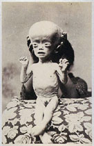 Now I am thinking I should have selected the plates on pages 164 and 165 for reproduction. At first these two photos did not hold my attention because to the glancing eye they appear to be two views of an infant that perished in a fire. I realize now they are probably the very first photographic evidence of a "stone baby", specifically a third trimester calcified fetus which formed during an asymptotic pregnancy. Furthermore, I propose that the stone faced young woman portrayed on page 151 was the mother who carried the fetus. Guessing what lies within that mound on her abdomen is like guessing what objects swell under a blanket of snow, but to my eye it shows a harder definition than what a tumor would push out.
