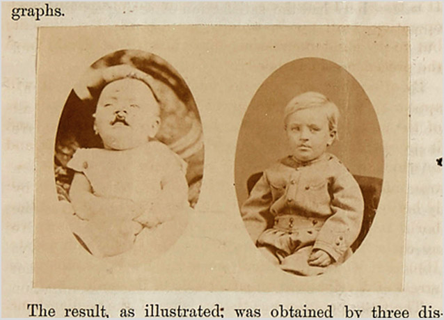 Composite portraiture of a child with cleft lip, age 8 months before surgery and 3 years after surgery. It is a superb early example of in-text photographic illustration in an American medical journal.