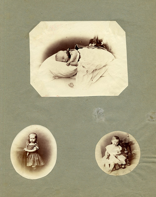 Another study of babies – Robinson can be identified with the lower right cameo in which the upholstered chair is the same prop used for his photograph titled, Sulee, exhibited in 1859 (Harker, Plate 53.). Composition, vignetting and mood of the left cameo is remarkably similar to Robinson's photograph titled Fleeting expression of a child (1857-1858). This set of babies and the three which follow also date somewhere between 1857 and 1859. It should be noted that Robinson learned vignetting from Dr. Diamond who invented the technique.